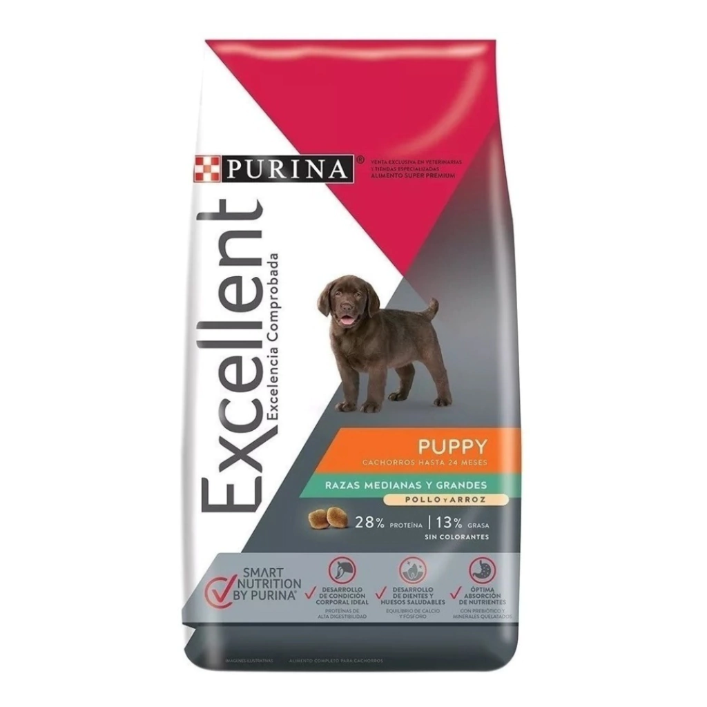 PURINA Excellent Cachorro Pollo y Arroz Razas Medianas y Grandes ofrece una fórmula completa y balanceada a base de proteínas de alta calidad, incluyendo tocoferoles mezclados -fuente de vitamina E- y sin colorantes ni saborizantes arti?ciales, para garantizar la calidad nutricional de sus fórmulas y un sabor único e irresistible.