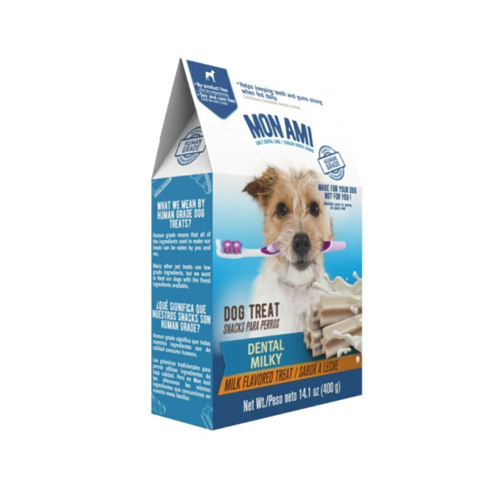 Caja 400g Dental Milk Para Perros Incluye 2 bolsitas con 200g c/u ¿Sabés lo importante que es la salud dental de tu perro? ¿Le das el cuidado que requiere? La higiene dental ayuda a prevenir enfermedades y mejora el aliento de tu mascota. Como sabemos lo tedioso que es realizar cotidianamente la limpieza dental de tu perro, desarrollamos Mon Ami Dental, una solución para este problema. El uso diario y continuado de Mon Ami Dental ayudará a que tu mascota mantenga su salud bucal de manera práctica, fácil y segura.