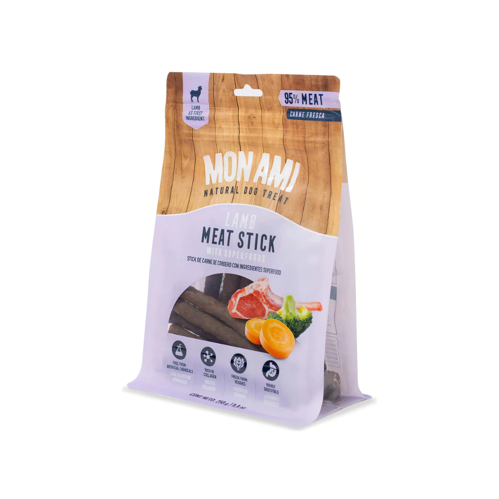 Deliciosos snacks de carne de cordero, ideales para disfrutar en cualquier momento. Perfectos para quienes buscan una opción sabrosa y nutritiva. Estos snacks son una golosina perfecta para premiar a tu mascota, ya que están diseñados específicamente para perros. Con una textura crocante que encantará a tu peludo, cada bocado es una explosión de sabor. La línea Meat Stick de Mon Ami garantiza calidad y frescura, con un peso neto de 250 grs. Sorprende a tu compañero con un snack que no solo es delicioso, sino también saludable. ¡Haz que cada momento de juego sea especial con Snack Mon Ami!