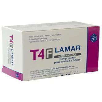 Dosificación: 0,02-0,03 mg/kg una vez al día o dividida en dos administraciones, según el caso clínico. Para T4 “F”: corresponde aproximadamente a 1 comp/45 kg de peso una vez al día. La dosis se relaciona mejor con la superficie corporal: 0,5 mg/m2, por lo que es menor, por cada kg, en animales pesados. La mejoría de los síntomas generales y nerviosos se observa a las seis semanas, de lo contrario probablemente deba replantearse el diagnóstico. Las lesiones de piel tardan más en mejorar. El tratamiento es de por vida, y se gradúa la dosis de acuerdo al caso individual.